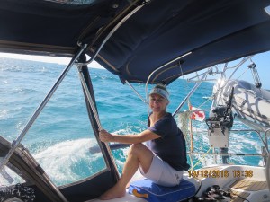 L’eau cristalline du Grand Banc est invitante mais nous avons filé à toute allure – voile et moteur – afin de devancer le passage d’un front froid. Comme prévu, les trois dernières heures ont été inconfortables. Le vent au près a forci à 18 nœuds avec des pointes à 22 nœuds, accompagné de vagues courtes entre 4 et 6 pieds.