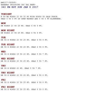 Après une très belle sortie en mer du côté Atlantique, c’est le repos pour quelques jours, le temps de laisser passer un front météo. Ce front balaye la côte est de l’Atlantique, en passant par les Bahamas et jusqu’à Cuba. Il apporte des vents du nord soutenus, de 20 à 30 nœuds, avec des pointes à 35 nœuds. Inutile de dire que dans ce cas-là, le mot d’ordre est : abritez-vous !