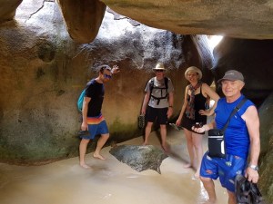 Après ces arrêts, la chaleur se faisait de plus en plus sentir… mais aucune plainte ne fut formulée ! Quoi de mieux que d’aller se rafraîchir à The Baths, l’attraction #1 – et avec raison – de Virgin Gorda. The Baths est aussi accessible par la mer. Ce fut une petite escalade à travers de très gros rochers de granit s’empilant et se côtoyant parfaitement les uns aux autres. Ce dédale de rochers et de passages très étroits sont parfois reliés par des cordes, des escaliers et des petits ponts. Quelques acrobaties plus loin, nous avons abouti à une petite plage de sable blanc où la baignade fut divine. Quiconque visite les BVI, The Baths constitue un MUST.