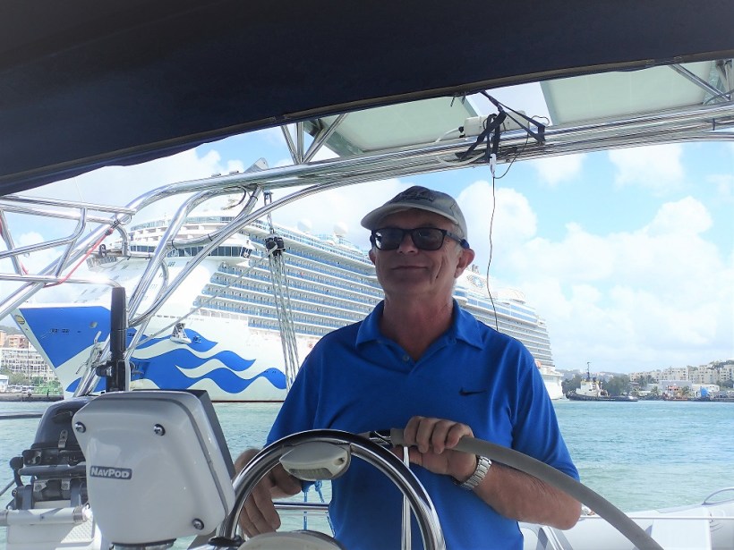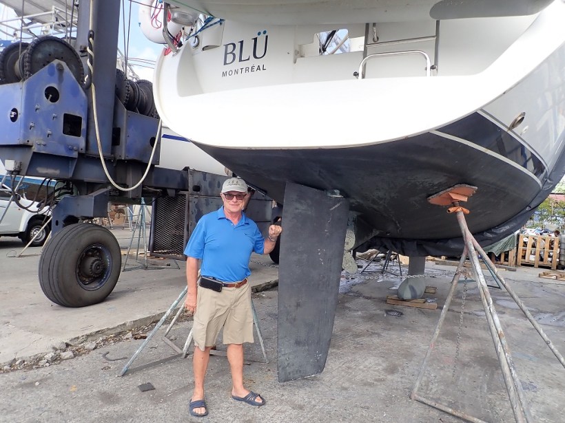 Même si notre séjour au chantier de Careneantilles à Fort de France n’était pas des plus exotiques, le personnel a été attentif à nos demandes, particulièrement Claude, opérateur de gru. D’une main de maître, il a en effet initialement sorti BLÜ de l’eau, procédé à son levage en prenant soin de positionner l’arrière du bateau au-dessus de la rampe de mise à l’eau à trois reprises afin que nous puissions enlever le safran, le poser pour un essai une fois réparé et ensuite pour l’installation finale. Aujourd’hui, c’était la mise à l’eau. Sa bonne humeur et ses encouragements nous ont été précieux. Quant à Jimmy, il nous a aidés à enlever le safran et pour l’installation finale.