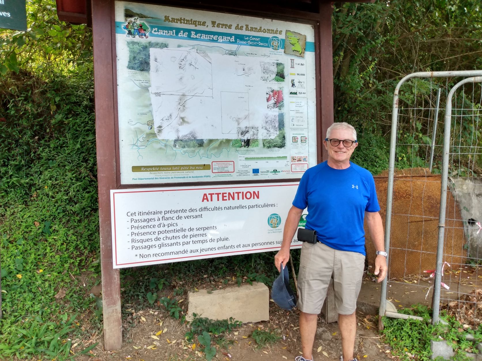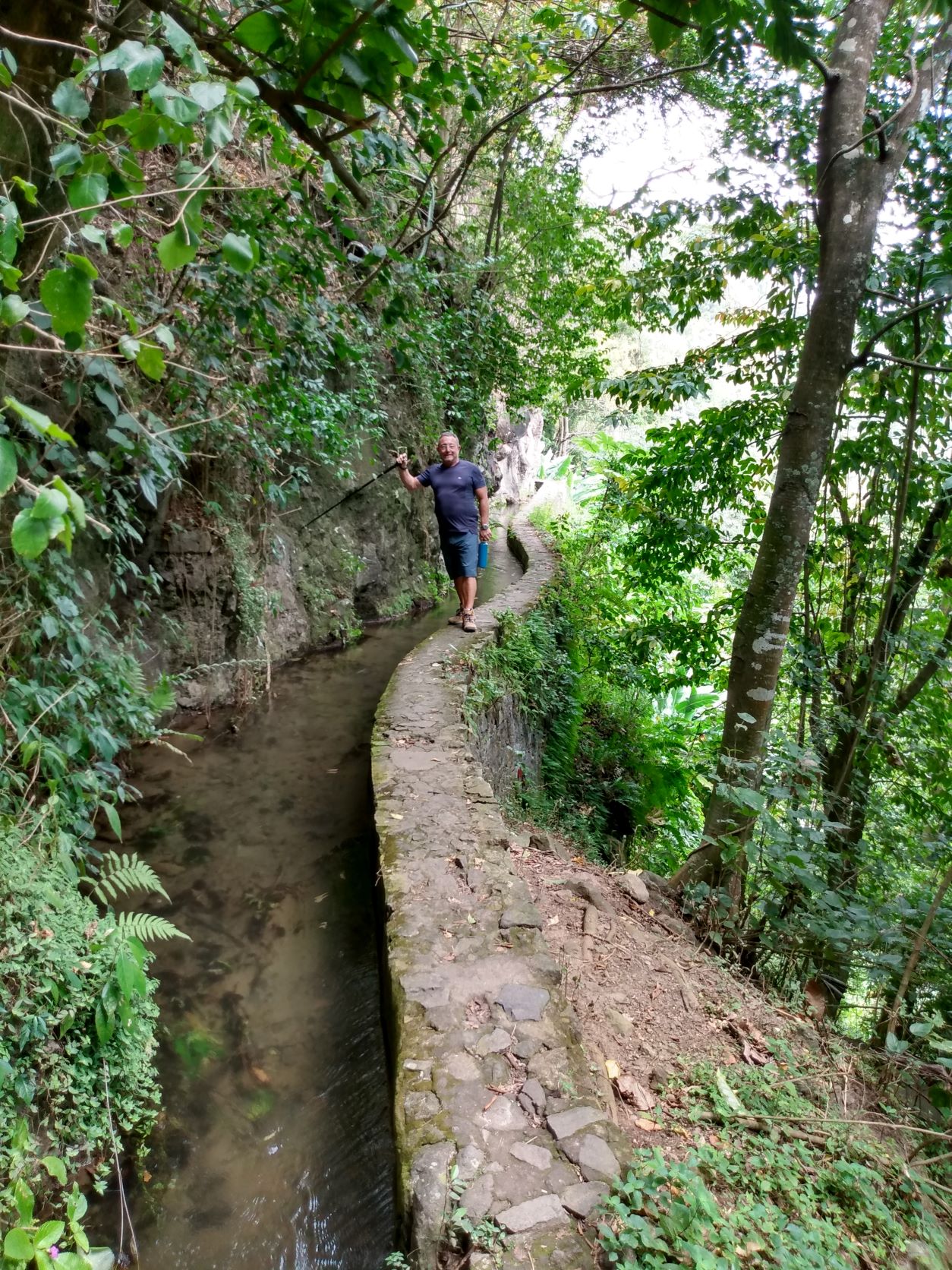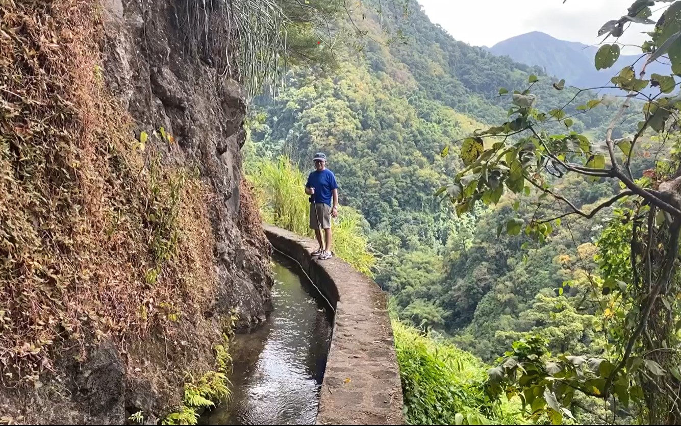 Nos deux capitaines se sont non seulement replongés dans l’histoire, mais aussi sur un circuit linéaire de 6,5 km (aller-retour) où ils ont marché sur un étroit muret de 30 à 40 centimètres, sans barrière de protection, dont certaines parties sont à des pics de dizaines de mètres ! L’attention étant portée sur chaque pas, il devenait périlleux de s’attarder sur la vue plongeante pour admirer la rivière du Carbet ou les plantations d’Anthurium, d’Alpinias, de Roses de Porcelaine ou d’Oiseaux du Paradis. À l’occasion, c’est sur un petit chemin boueux que la marche s’est poursuivie.